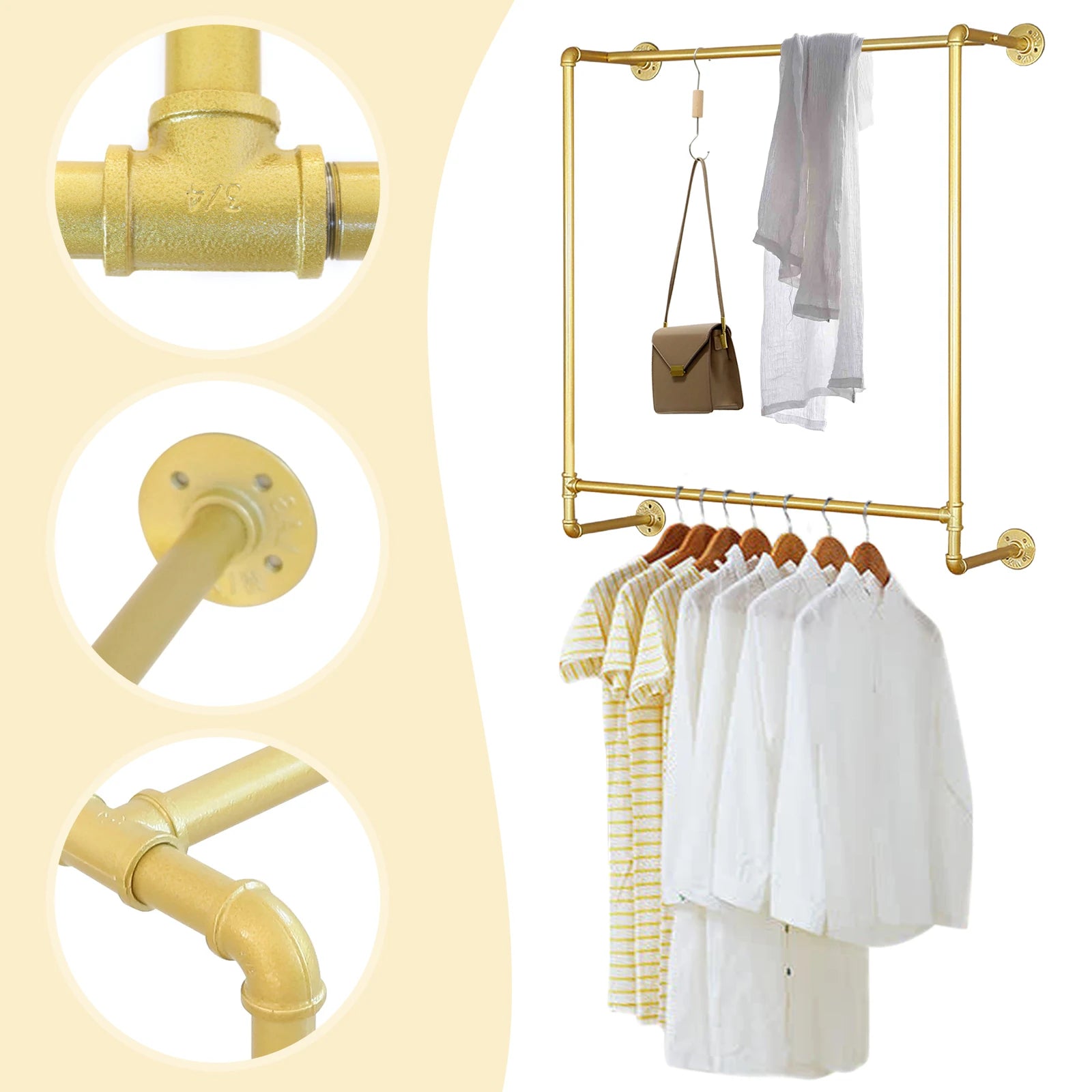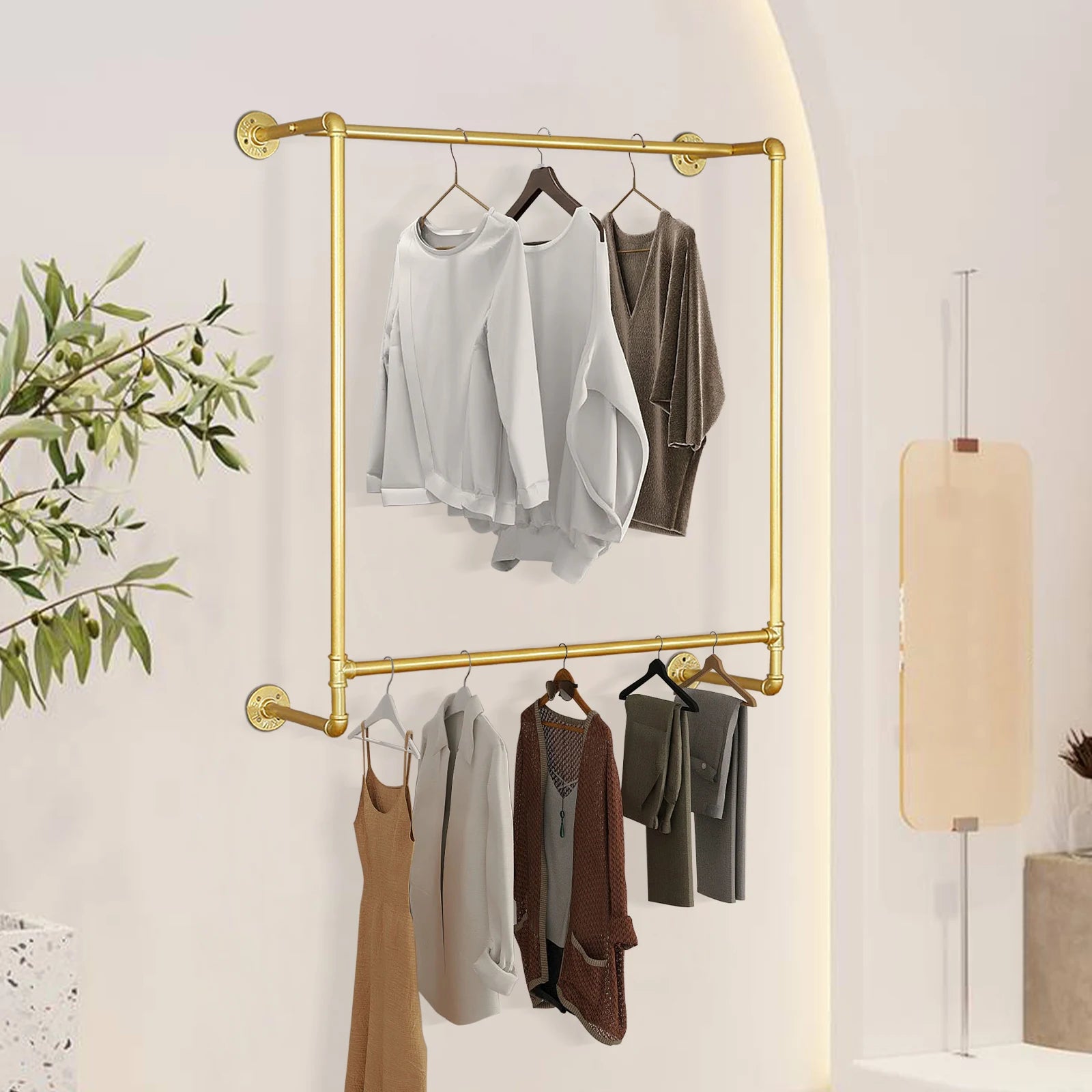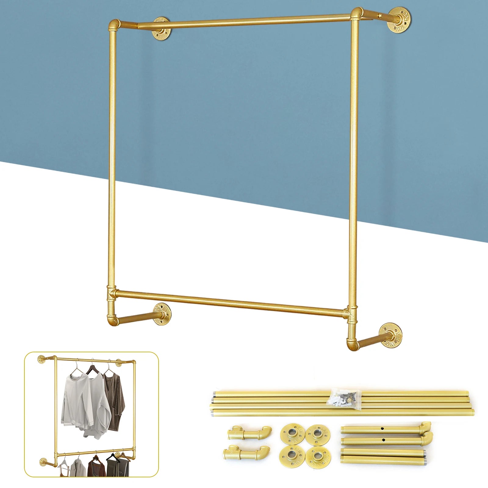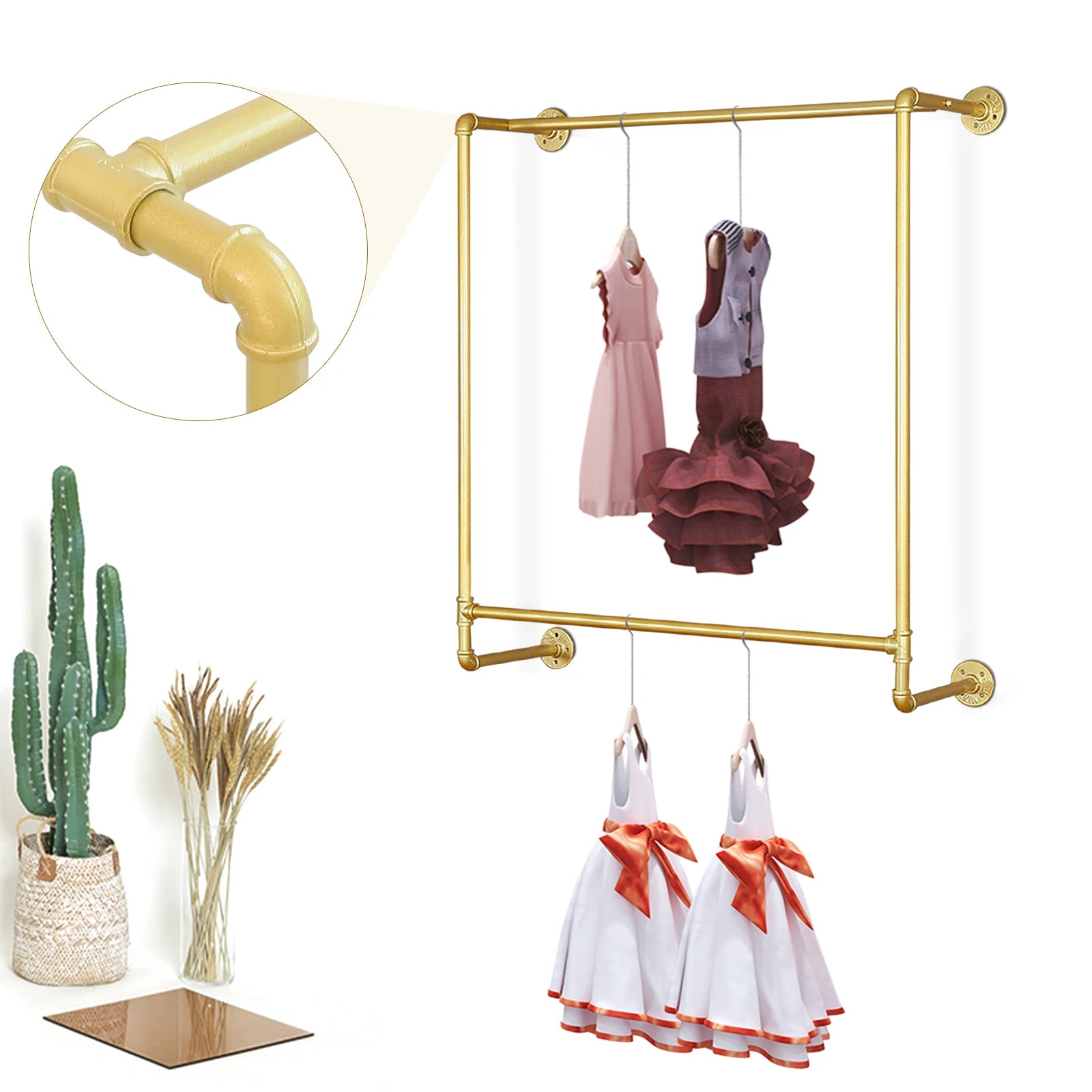 Gold Iron Industrial Pipe Wall Mounted Clothing Rack Wedding Dress Bridal Garment Rack Stand Retail Display Closet Organization